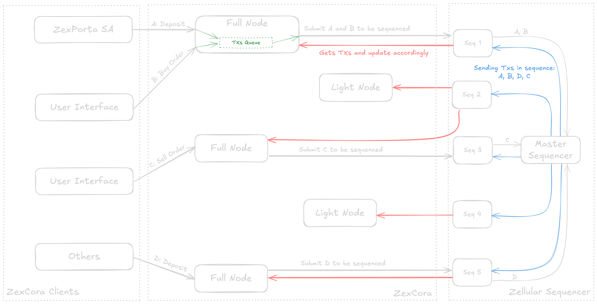 Transaction Submission Transactions are initiated by ZexPorta SA, user interfaces (UI), or other external sources acting as ZexCora clients. These transactions, such as deposits, buy orders, and sell orders, are sent to ZexCora Full Nodes.
