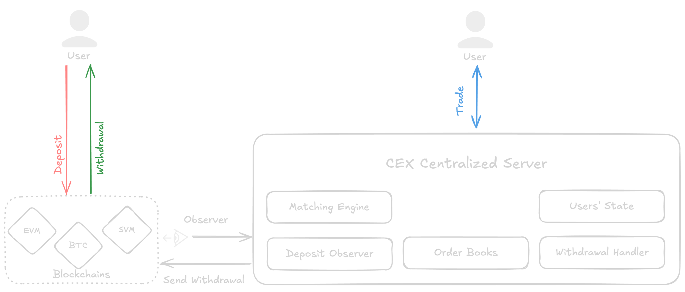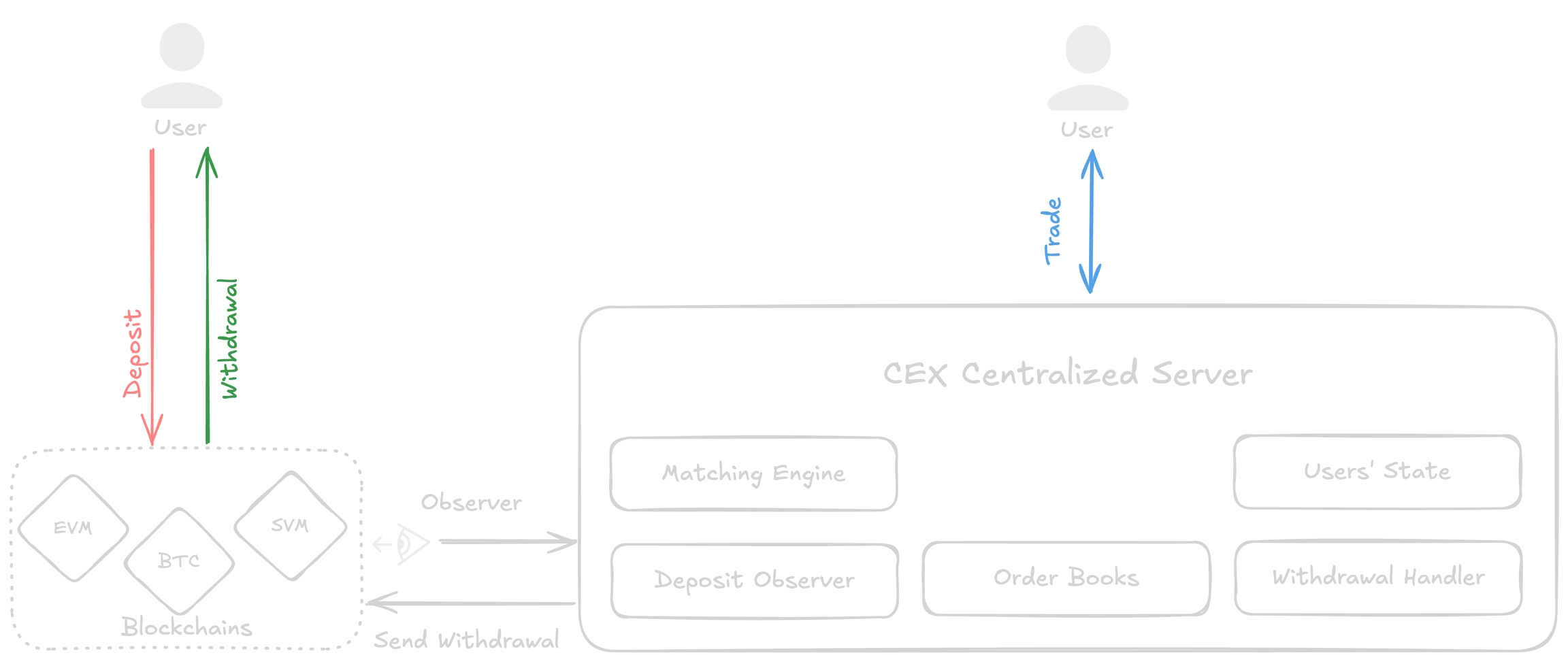 Unlike DEXs, where funds remain in users' wallets, CEXs custody user assets and manage balances through an internal ledger. This process involves:
